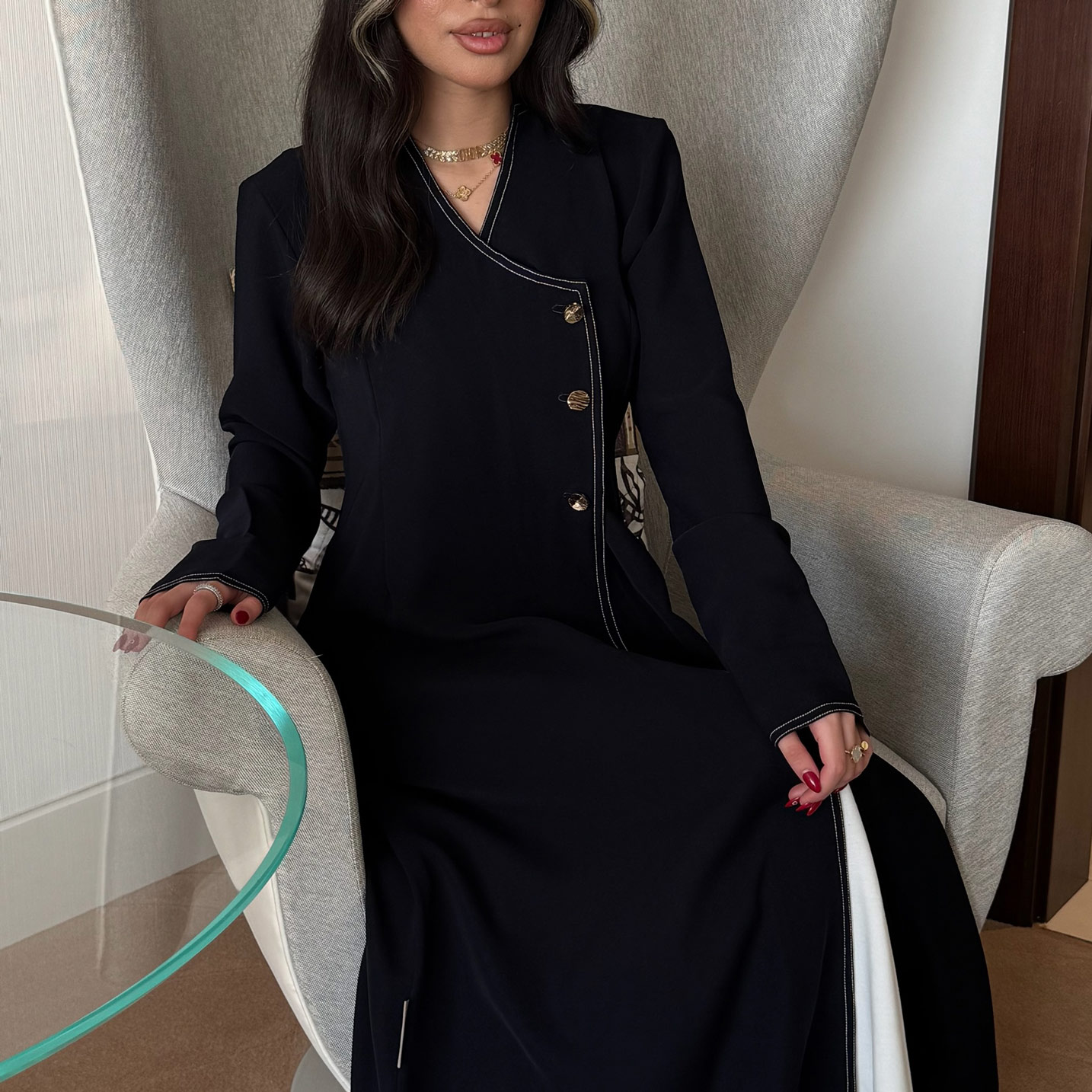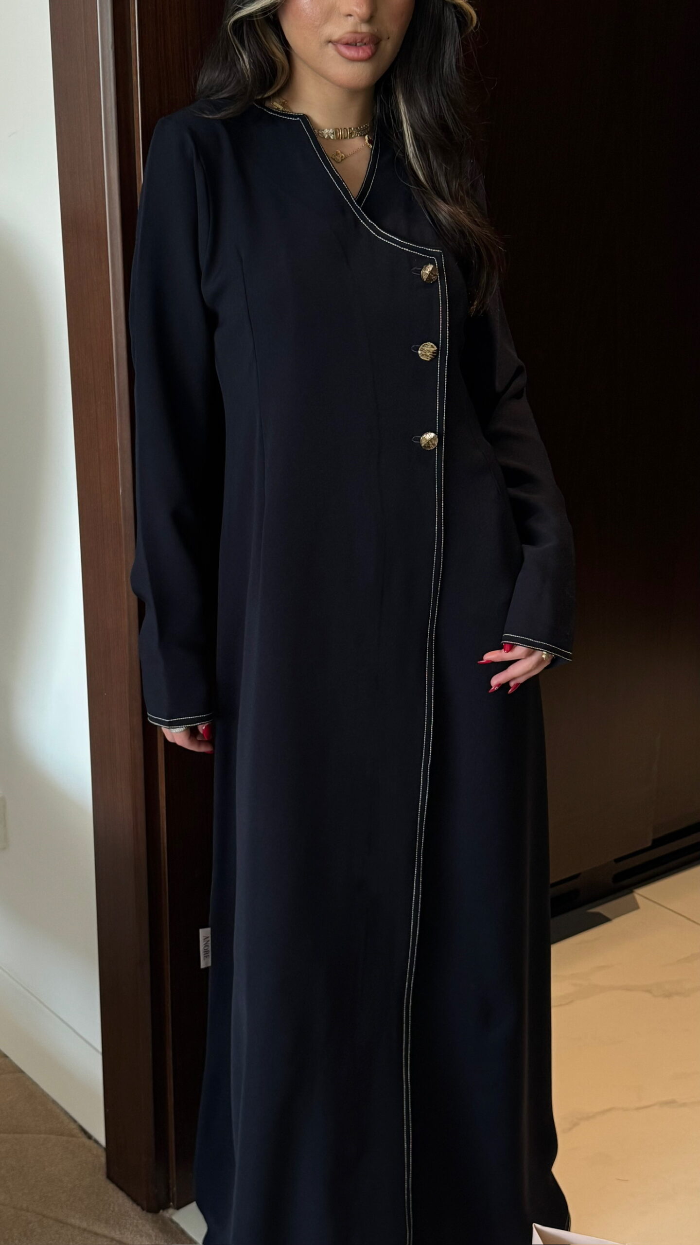 Navy abaya with gold buttons and stitching